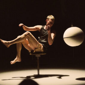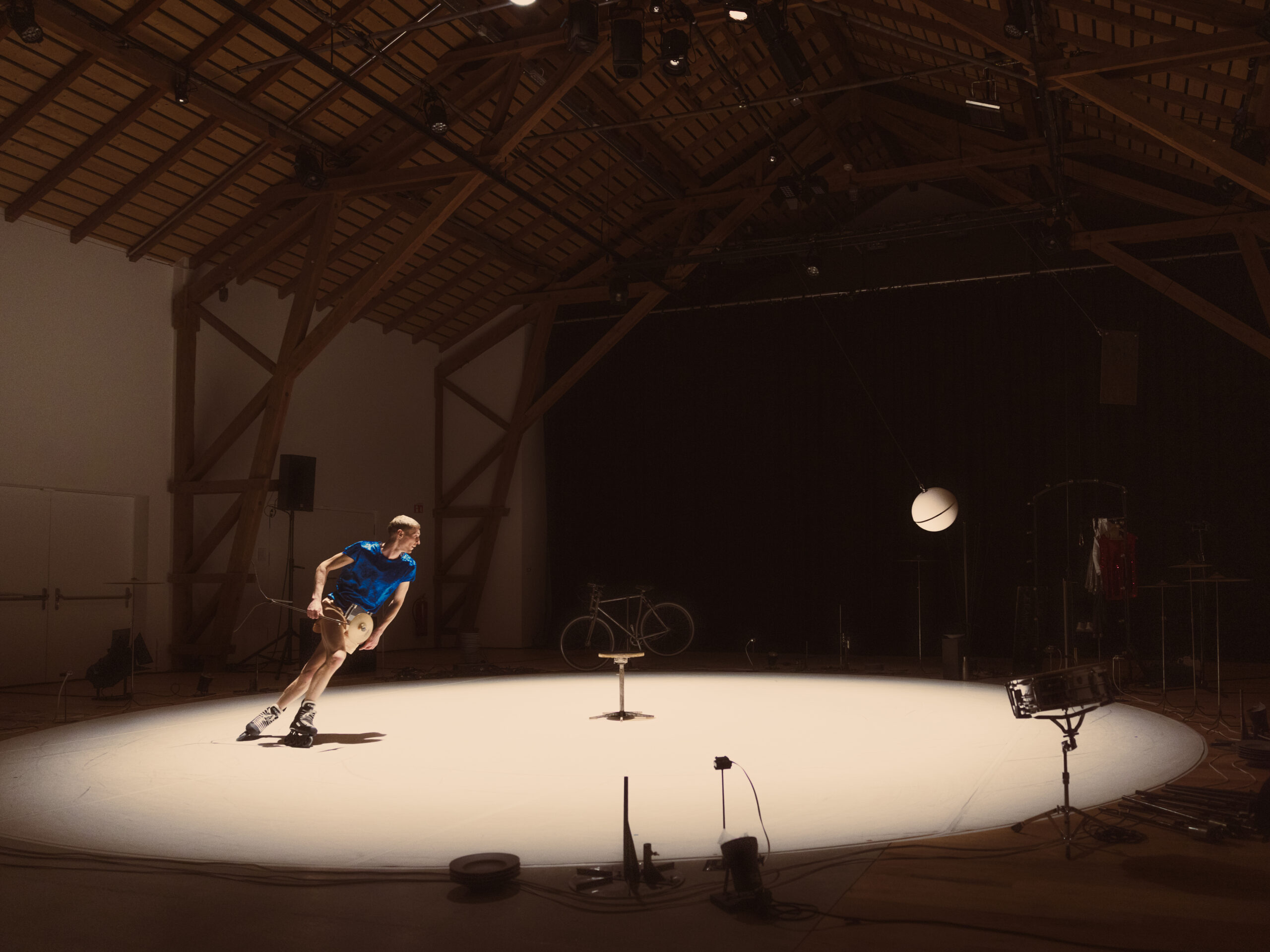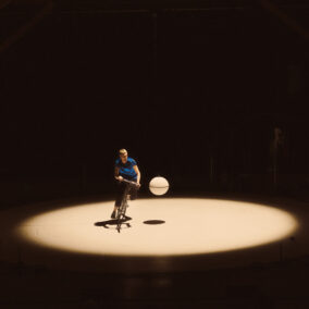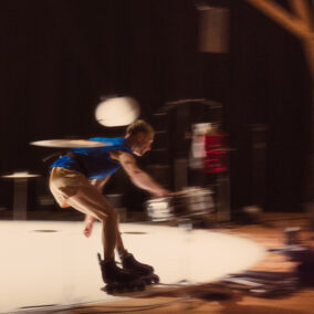 Le roulement de tambour vibre, une boule de céramique virevolte, l’artiste tourne et glisse sur ses rollers dans une quête effrénée après le temps, la céramique se casse et se fracasse… Entre goût du risque et joyeux stress, l’artiste Julian Vogel met en scène les contrastes et les équilibres fragiles qui déterminent la vie.