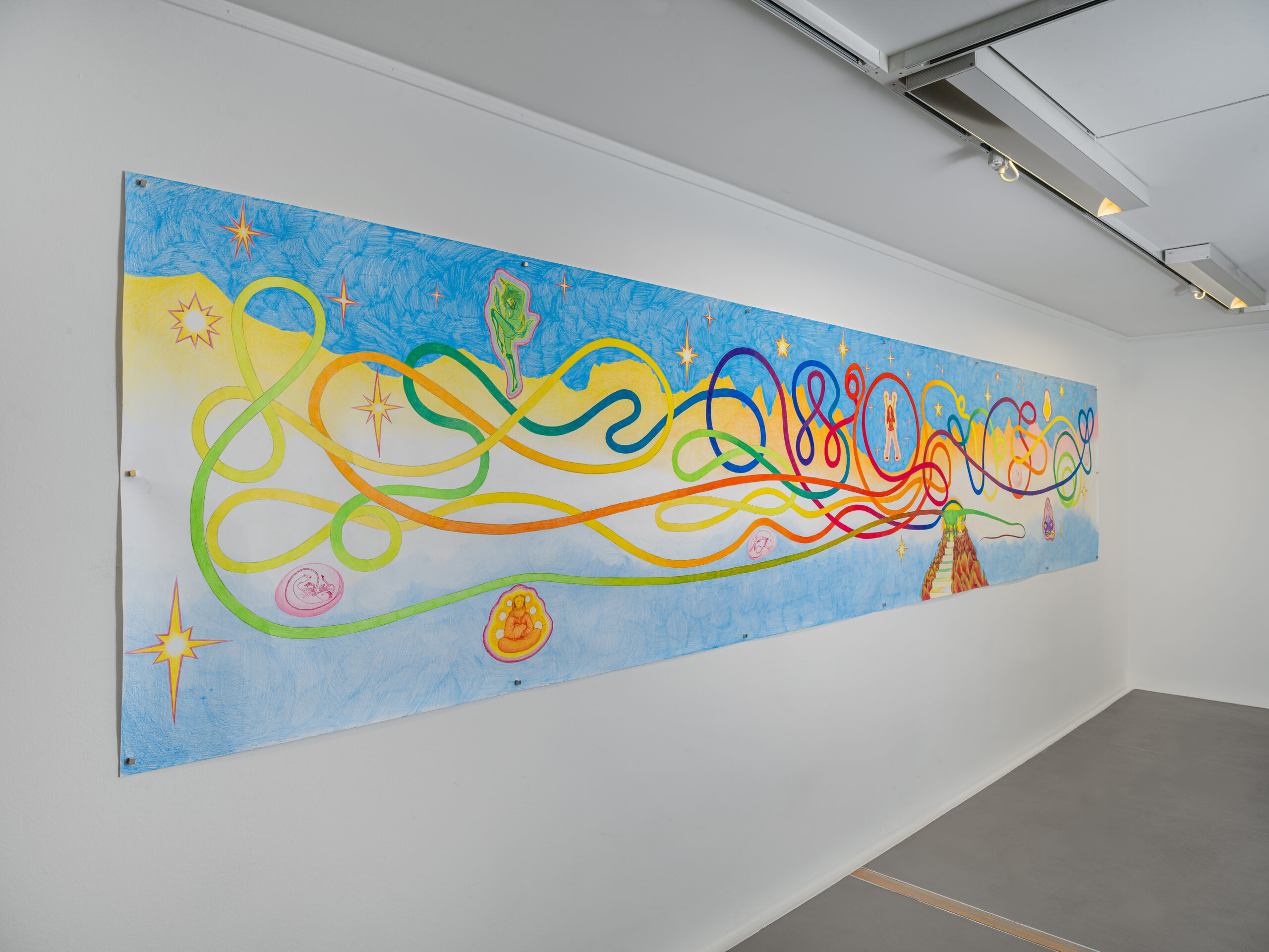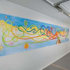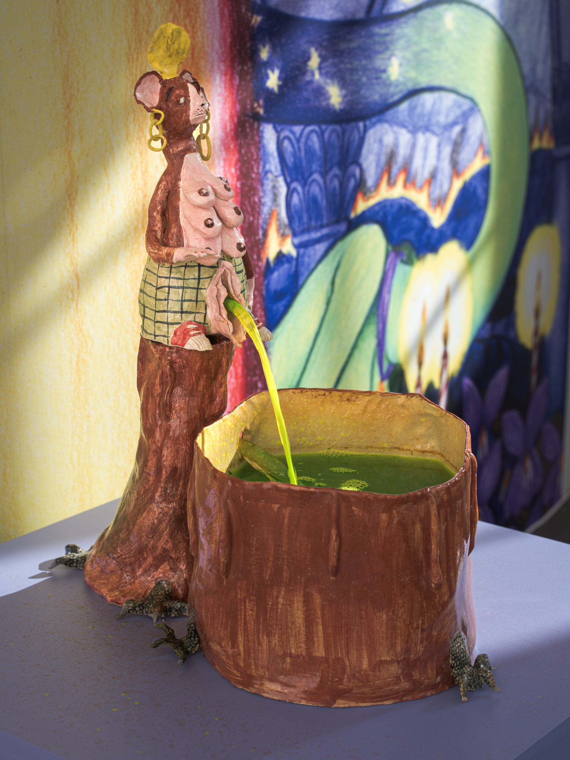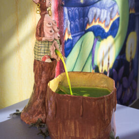 Les artistes jouent avec les codes de l’humour et de l’absurde pour construire leurs propres mythologies. Peuplées de créatures magiques et énigmatiques, elles questionnent les relations entre les êtres vivants, la relation aux souvenirs et à la construction de sa propre foi ainsi que les structures de pouvoir qui façonnent notre existence.